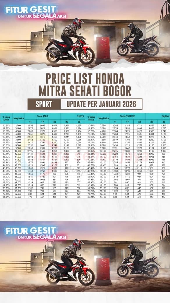 | ALL NEW CRF 150 L MMC | 37,375,000 | 3800 | 3300 | 2711 | 3200 | 2168 | 3000 | 1853 | 2800 | 1638 |