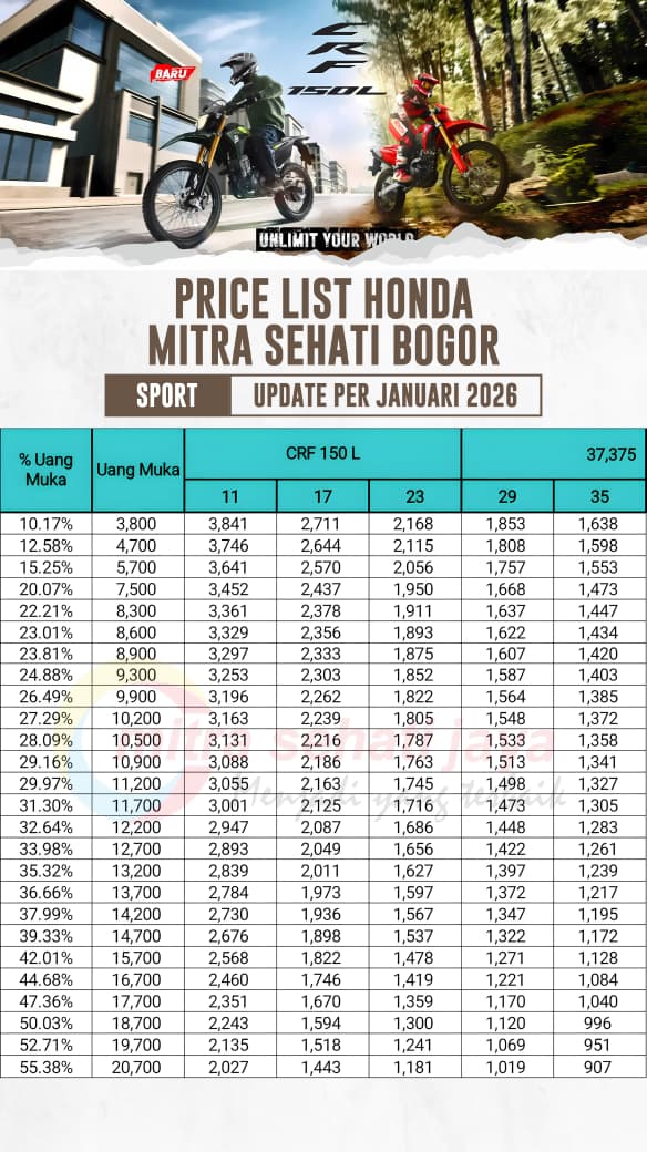 | ALL NEW CRF 150 L MMC | 37,375,000 | 3800 | 3300 | 2711 | 3200 | 2168 | 3000 | 1853 | 2800 | 1638 |